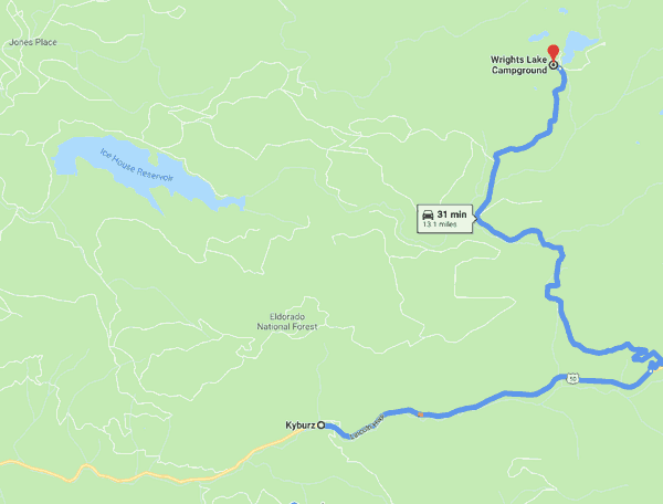 The sign above appears just about where the “31 min” indicator is on the map below. The six miles are to the turn onto Route 50, north of Kyburz.
