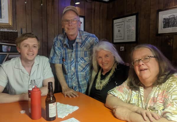 I booked myself onto their return flight to Milwaukee and made arrangements for a hotel because they were all mentally exhausted and not prepared to host me on short notice. I got to meet my cousin Tom (in hat, below) for the first time. We had been chatting on Facebook for about a year, and he was recently diagnosed with esophageal cancer and is in treatment for it, so he did not travel to the funeral. We met at his favorite Mexican restaurant in Milwaukee. The two other cousins I got to hang out with for many hours over several days in both New York and Milwaukee, making those heartfelt connections that were truly the high point of my trip.