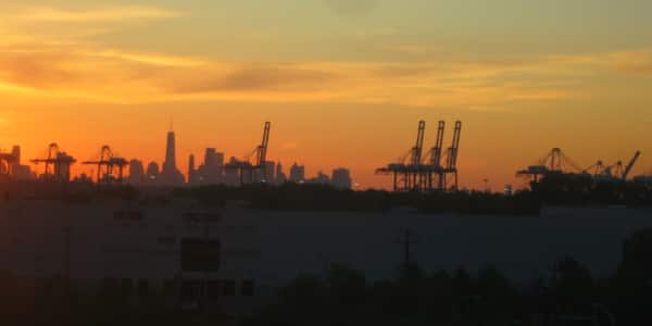 Sunrise Behind Manhattan Skyline Behind Elizabeth NJ Shipyard