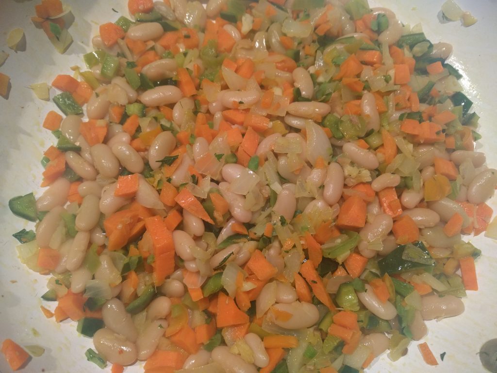 Years ago, I bought some flageolets at a farmer’s market and I have been saving them in a jar. I finally cooked them up according to a French cookbook, blanching first then using a pressure cooker for 15 minutes instead of simmering them for an hour. They are delicious! Here they are sauteed with peppers, carrots, onions, garlic and ginger. I later added mushrooms, brown rice and kale fresh-picked from my garden.